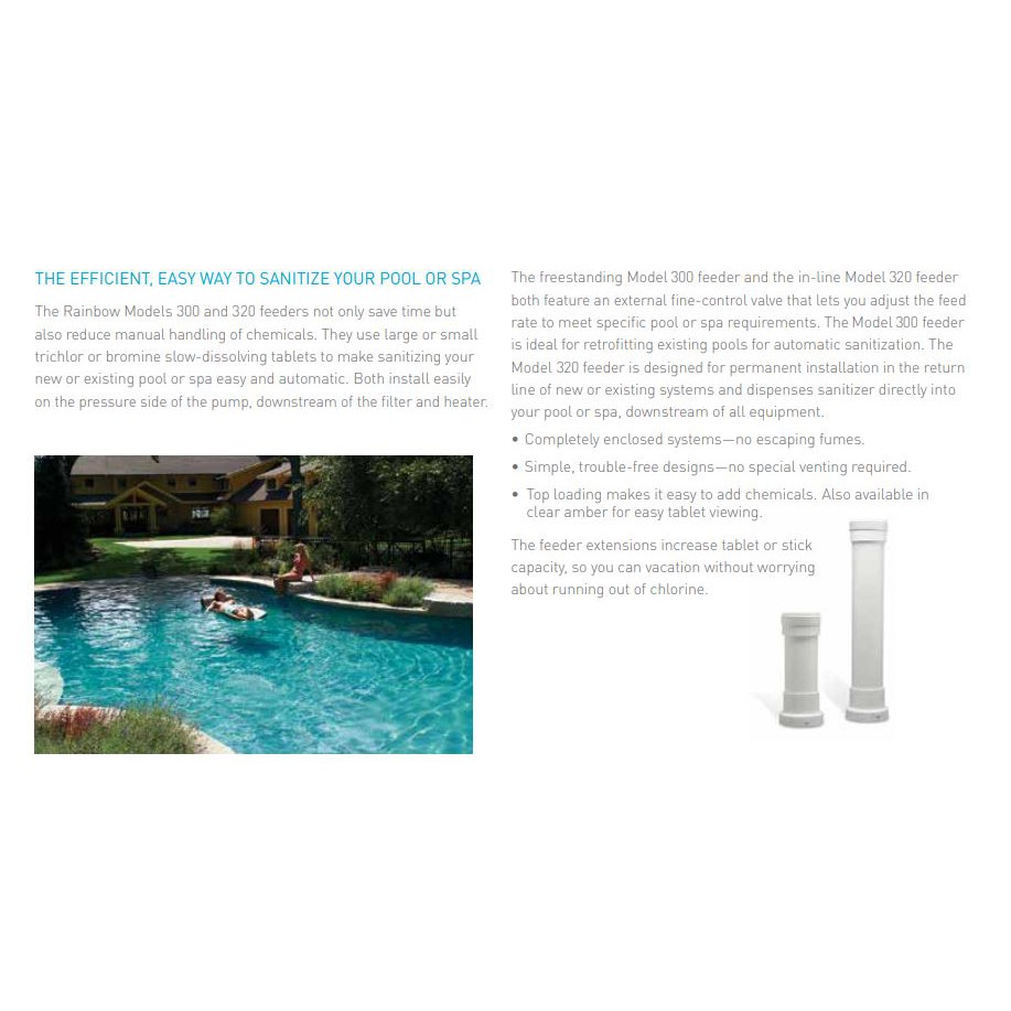 The rainbow models 320 automatic chlorine/bromine feeder not only saves time, but also reduces manual handling of chemicals. If feeder is being installed on a pool, spa or pool/spa combination, correct plumbing procedures . Hey gang, i have a pentair rainbow in line chlorinator for my inground. Google pentair 320 chlorinator and you'll see what i mean. The first is that older tablets do not dissolve that well and if this is the .